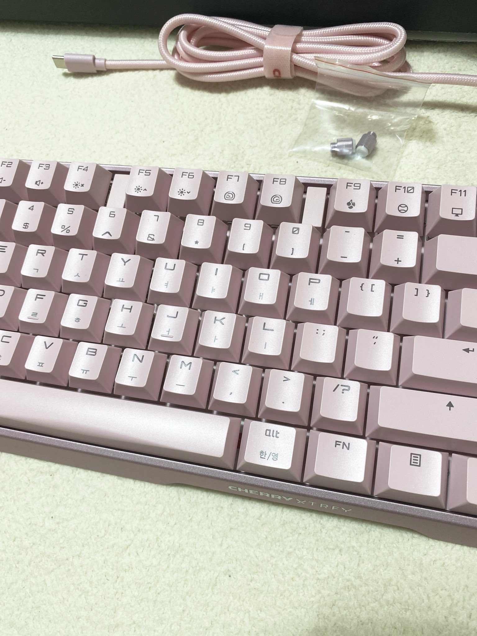 핑크 색상이 촌스럽지 않고 세련되며, 무광 하우징과 체리 특유의 깔끔한 각인이 어우러져 책상 분위기를 확 바꿔줍니다.